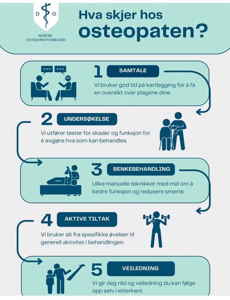 Kroppen har en egen evne til å lege seg selv, og osteopatens jobb er å kartlegge årsaken til smerte og/eller nedsatt bevegelighet, gjennom en grundig samtale og undersøkelse. Deretter skal osteopaten legge til rette for at kroppen leger seg selv. Det skjer gjennom samtale, behandling, treningstips og avspenningsøvelser tilrettelagt hvert enkelt individ.